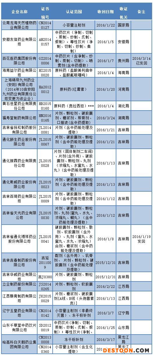 據(jù)不完全統(tǒng)計,目前被收回的22張GMP證書中,國家局,以及安徽、貴州、海南、河南、湖北、湖南、吉林、江蘇、江西、遼寧、山東、黑龍江等省藥監(jiān)局均已發(fā)布2016年收回GMP“第一炮”。