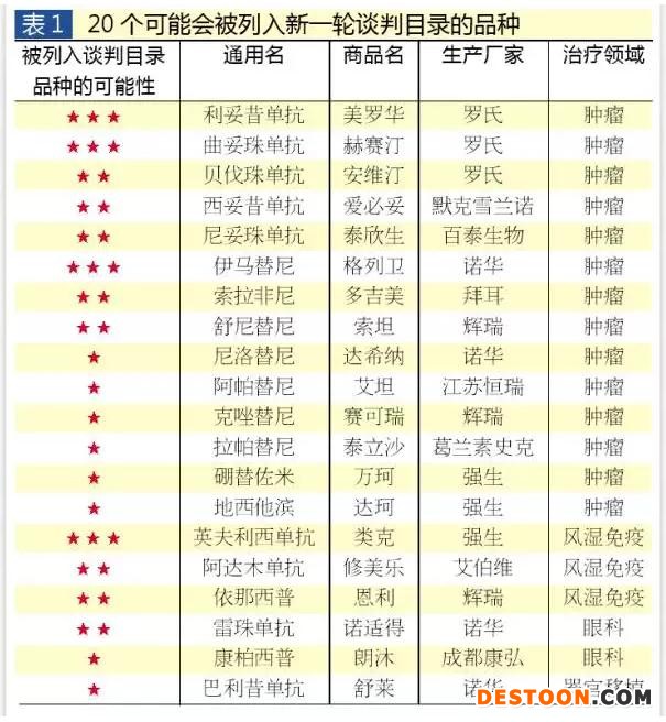 通過(guò)以上篩選,目前有超過(guò)20個(gè)品種可能會(huì)被列入新一輪的談判目錄,這其中大多數(shù)品種屬于癌癥用藥,其他一些品種主要針對(duì)風(fēng)濕免疫、失明和器官移植排異等嚴(yán)重疾病。(見(jiàn)表1,“★”星級(jí)代表短期被列入談判目錄品種的可能)