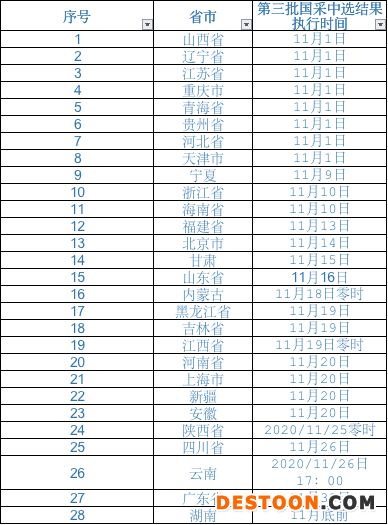 截至目前,據(jù)梳理,共28個省市已經(jīng)明確第三批國采中選結(jié)果的執(zhí)行時間,其中19個省市已經(jīng)執(zhí)行第三批國采,河南、上海、新疆、安徽四地將于明日執(zhí)行,僅湖北、西藏、廣西還未明確具體的執(zhí)行時間,但是總的來看,最晚在年內(nèi),第三批國采應(yīng)該能在全國范圍內(nèi)落地。